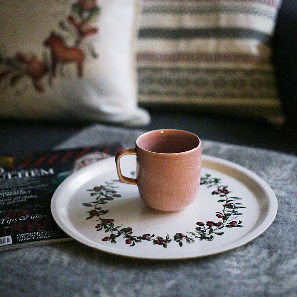 Tray "Lingonberry Wreath", 31 cm. Round serving tray in white with a beautiful motif of a wreath of lingonberry rice. A nice interior detail and an appreciated gift. Dishwasher safe.