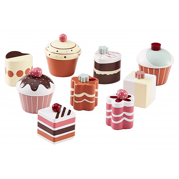 Pastries from Kids Concept. Deliciously designed wooden play pastries, painted in fine colors with painted berries and chocolate sauce. Invite all our best friends for an afternoon tea party. Perfect in the children's kitchen or kiosk! Included in the serie Kids Bistro.